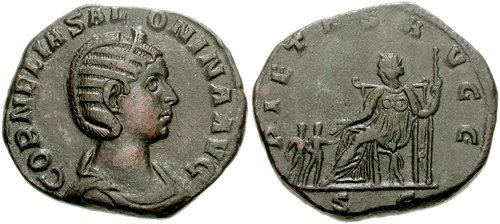 AV: CCORNELIA SALONINA AVG(usta) RV, PIETAS AVGG(ustorum)/ S(entatus) C(onsulto) (Sesterz RIC V -; MIR 36, 230d2 © CNG)